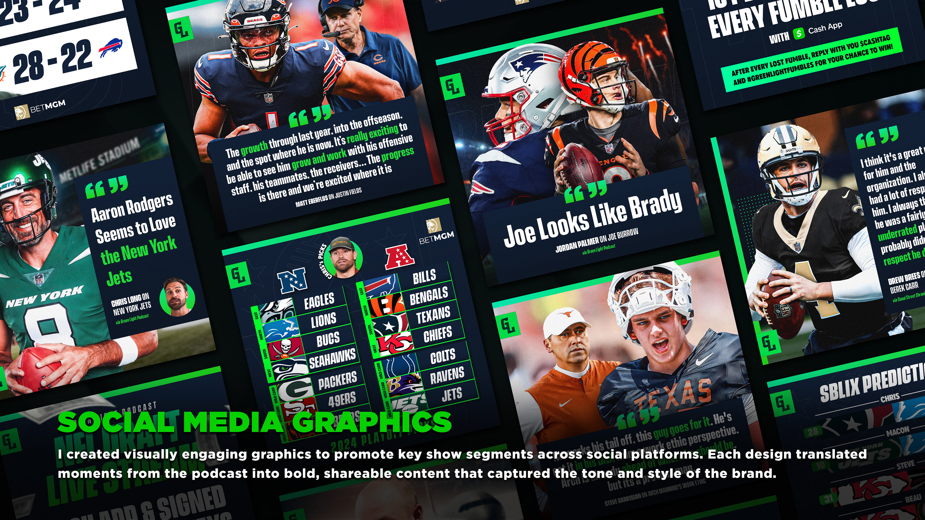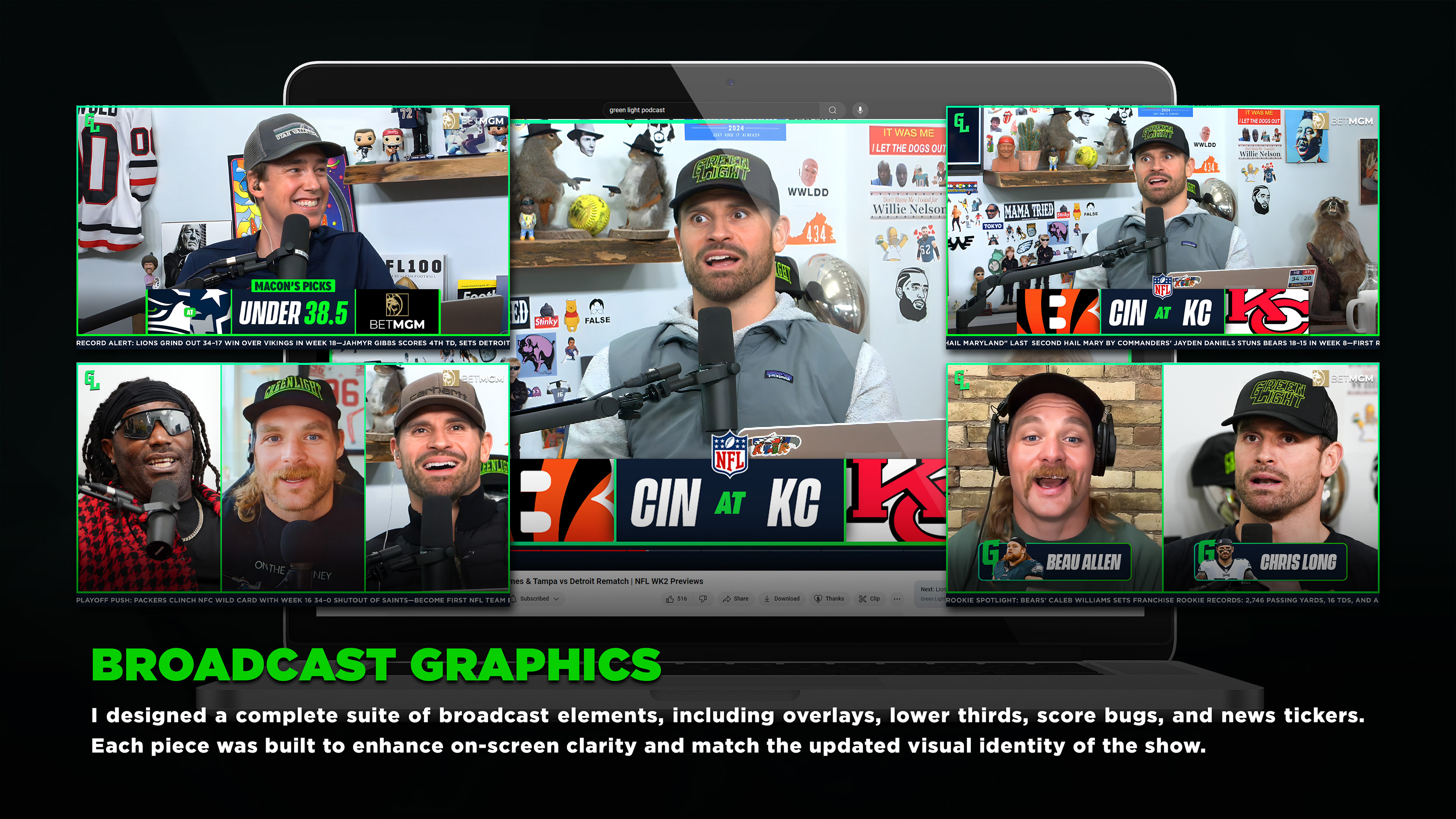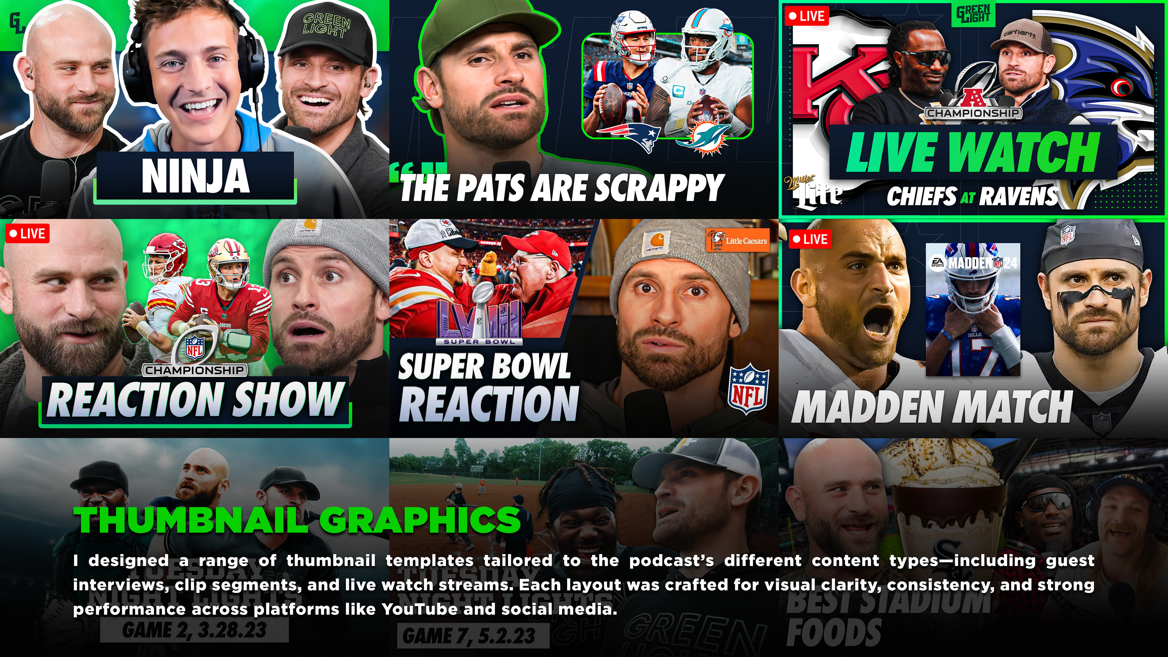 I was brought on by the Green Light Podcast team to lead a complete visual overhaul of their brand. Previously handled in-house, their graphics needed a more polished and professional look to match the show’s growing audience and ambitions.