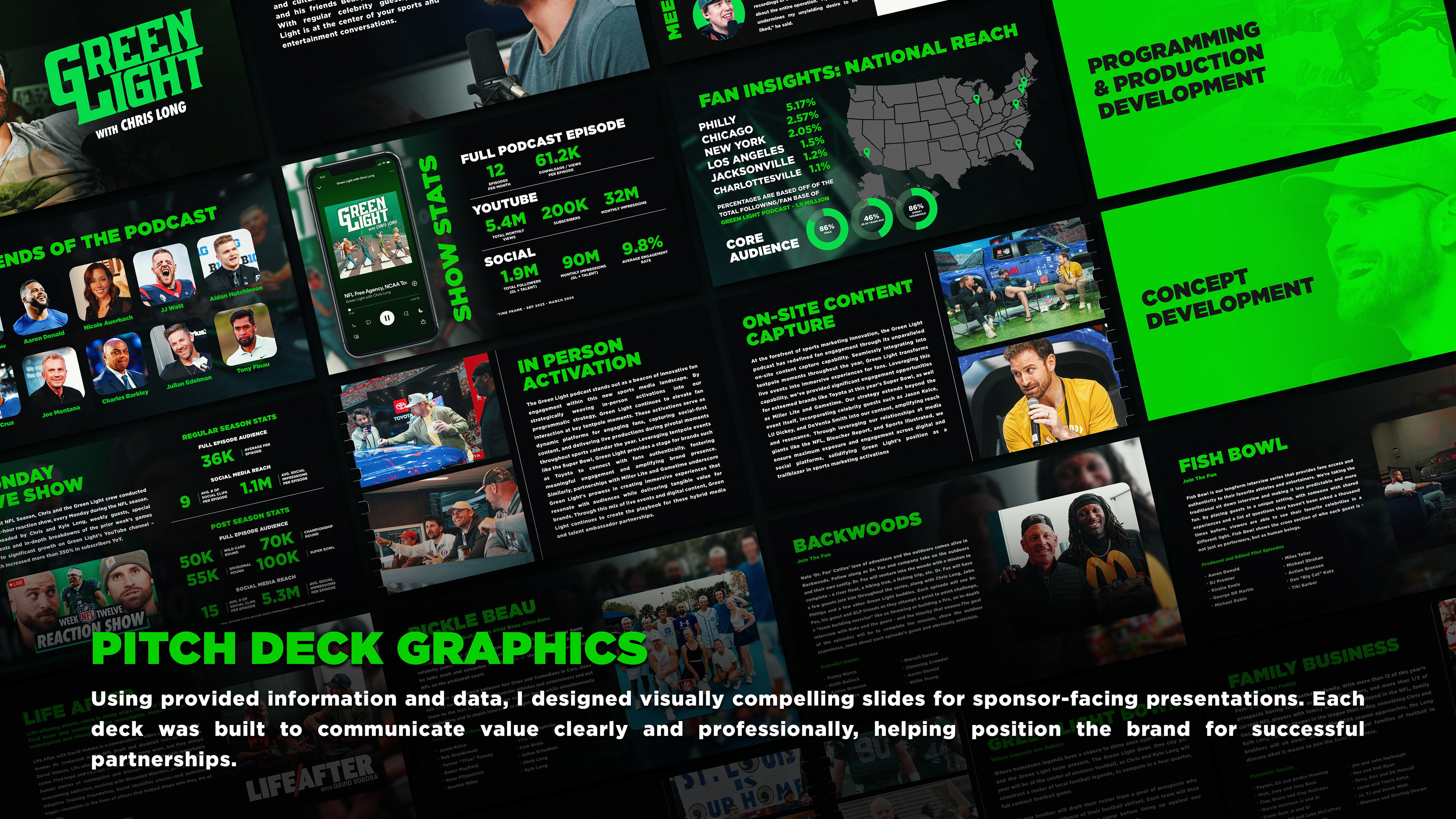 As the lead designer, I developed a cohesive visual system across all content touchpoints—from broadcast graphics and on-screen overlays to social media visuals, thumbnails, and sponsor-facing pitch decks. The result was a modern, consistent, and scalable design framework that elevated the podcast’s overall production quality and helped strengthen its visual presence across platforms.